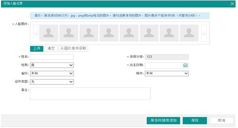 平臺(tái)可向各名單庫(kù)添加、編輯、刪除人員信息和人臉圖片,進(jìn)行人員信息和人臉圖片的信息注冊(cè),系統(tǒng)自動(dòng)完成人臉特征提取及建模,一個(gè)人員可對(duì)應(yīng)多張人臉圖片。