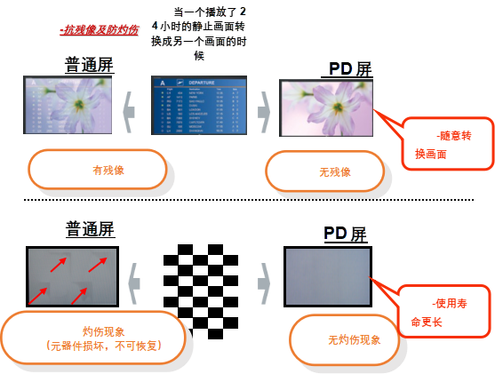 長時間播放同一畫面,有效的防止殘像和灼傷的產生,使用壽命更長