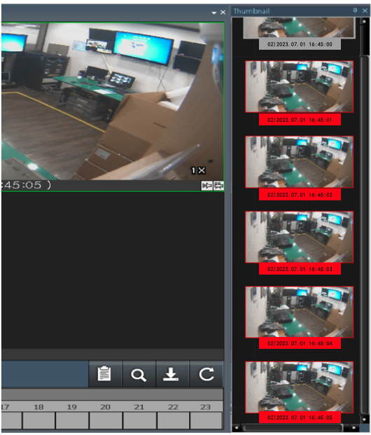 縮略窗口(在一個搜索窗口里):縮略圖能有效地看到每一秒(每一秒的第一幀)的圖像。它能還原第分鐘被丟掉的圖像。當你選擇其它攝像機時,它一樣能恢復。如果你點擊一個縮略圖時,它會顯示暫停。如果你想選擇你前一個時間點,雙擊縮略圖。一定時間間隔的縮略圖功能使得可以細分時間以識別事件發生時的確切時刻,對龐大存檔中的視頻進行搜索可以在幾秒鐘內完成,可以讓用戶自行設置不同的時間段(如按1小時、幾分鐘,甚至幾秒鐘)來對錄像資料進行搜索,大大減輕了工作人員的操作難度,提高工作人員的管理效率。