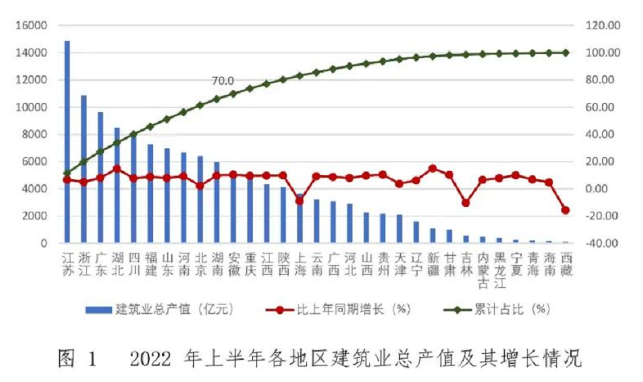2022年上半年,江蘇、浙江繼續領跑全國各地區建筑業,建筑業總產值雙雙超過1萬億元,分別達到14872.0億元和10866.6億元,分別占全國建筑業總產值的11.5%和8.4%。