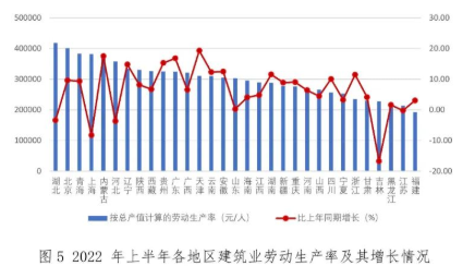 2022年上半年,26個地區的按建筑業總產值計算的勞動生產率保持增長。勞動生產率排序前三位的地區是湖北、北京和青海,分別為417901元/人、401117元/人和383289元/人。