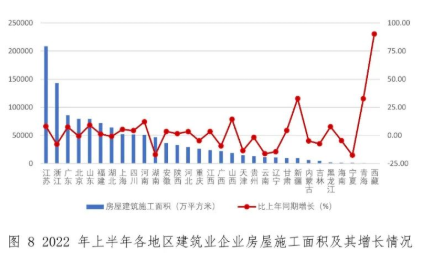 房屋建筑施工面積超過5億平方米的還有廣東、北京、山東、福建、湖北、上海、四川、河南等 8個地區。房屋建筑施工面積同比增長最快的是西藏,為90.1%。新疆、青海增幅均超過30%。