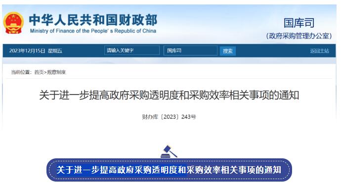 12月14日,財政部發(fā)布《關(guān)于進一步提高政府采購?fù)该鞫群筒少徯氏嚓P(guān)事項的通知》(財辦庫〔2023〕243號),本通知自印發(fā)之日起施行。明確: